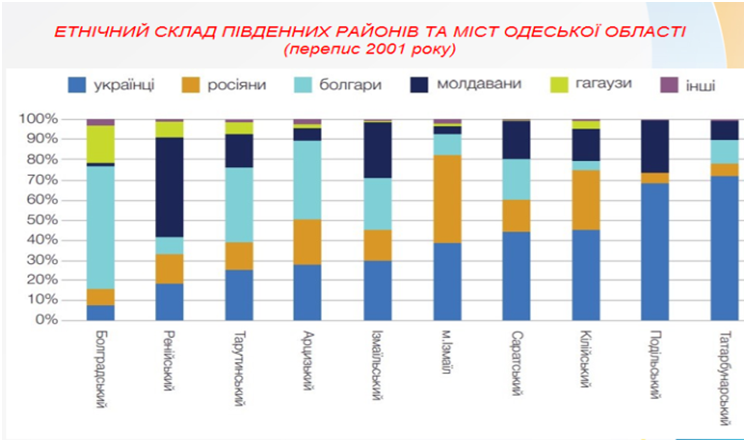 За переписом населення 2001 року серед представників 133 національностей, які проживають в області, найбільш чисельними етносами є українці – 1542341 особа (62,8%), росіяни – 508537 осіб (20,7%), болгари –150683 особи (6,1%), молдавани – 123751 особа (5,0%), гагаузи – 27617 осіб (1,1%), євреї – 13386 осіб (0,5%), білоруси – 12767 осіб (0,5%) та інші.